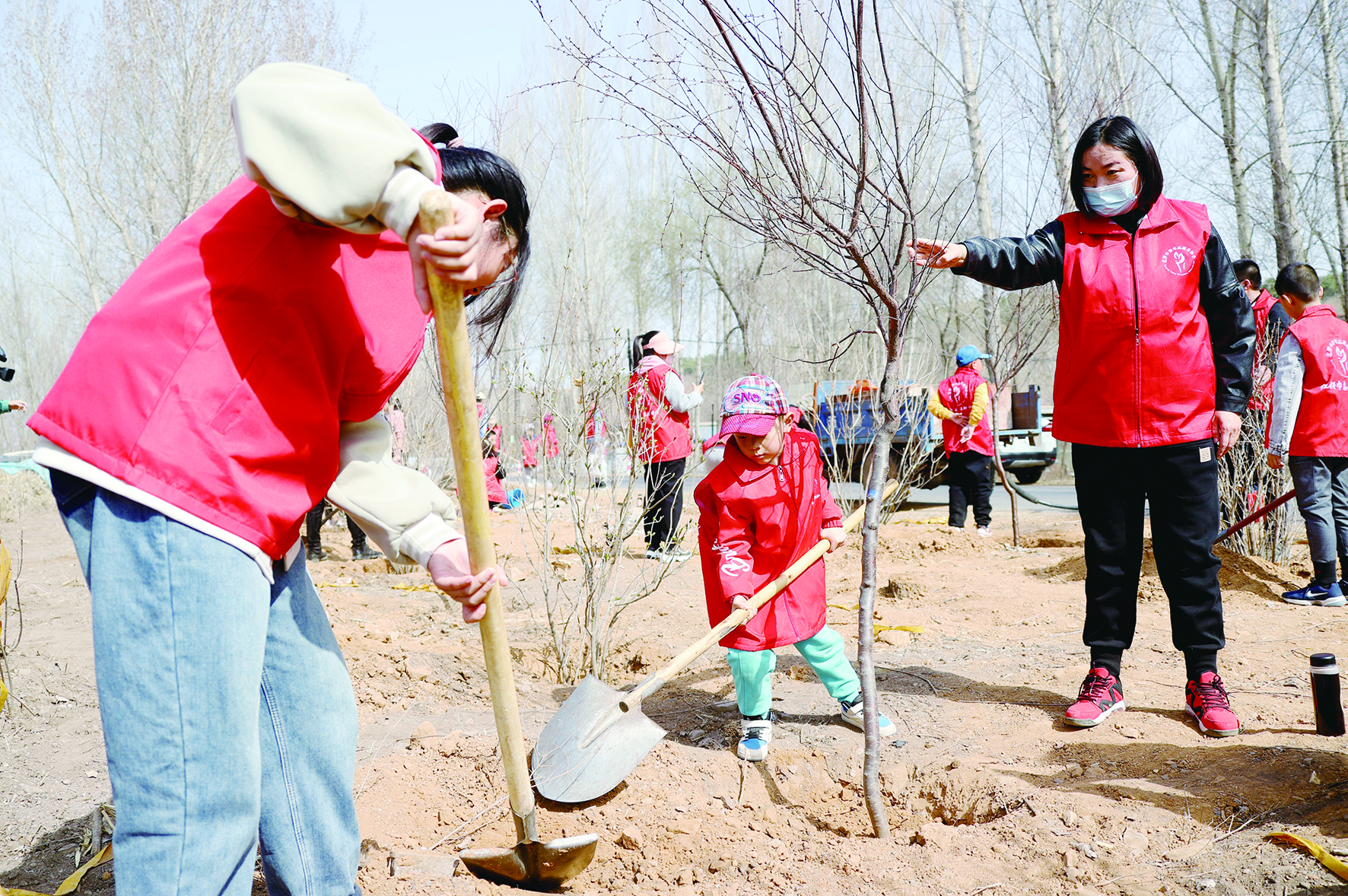 由团市委、三宝乡、市青年志愿者协会联合组织6至14周岁的青少年参加的“小手拉大手 共创文明城”亲子植树家长和孩子热情高涨,挥锹铲土、扶树填土、培土浇水,改善了乡村环境。